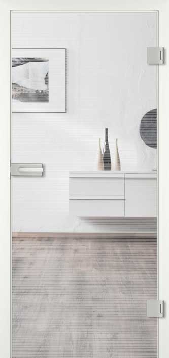 Der Wechsel von matten und transparenten Bereichen macht Siebdruck Glastüren optisch besonders ansprechend. Zudem bietet eine mit Siebdruck gestaltete Ganzglastür Sichtschutz, ohne den Raum zu verdunkeln.